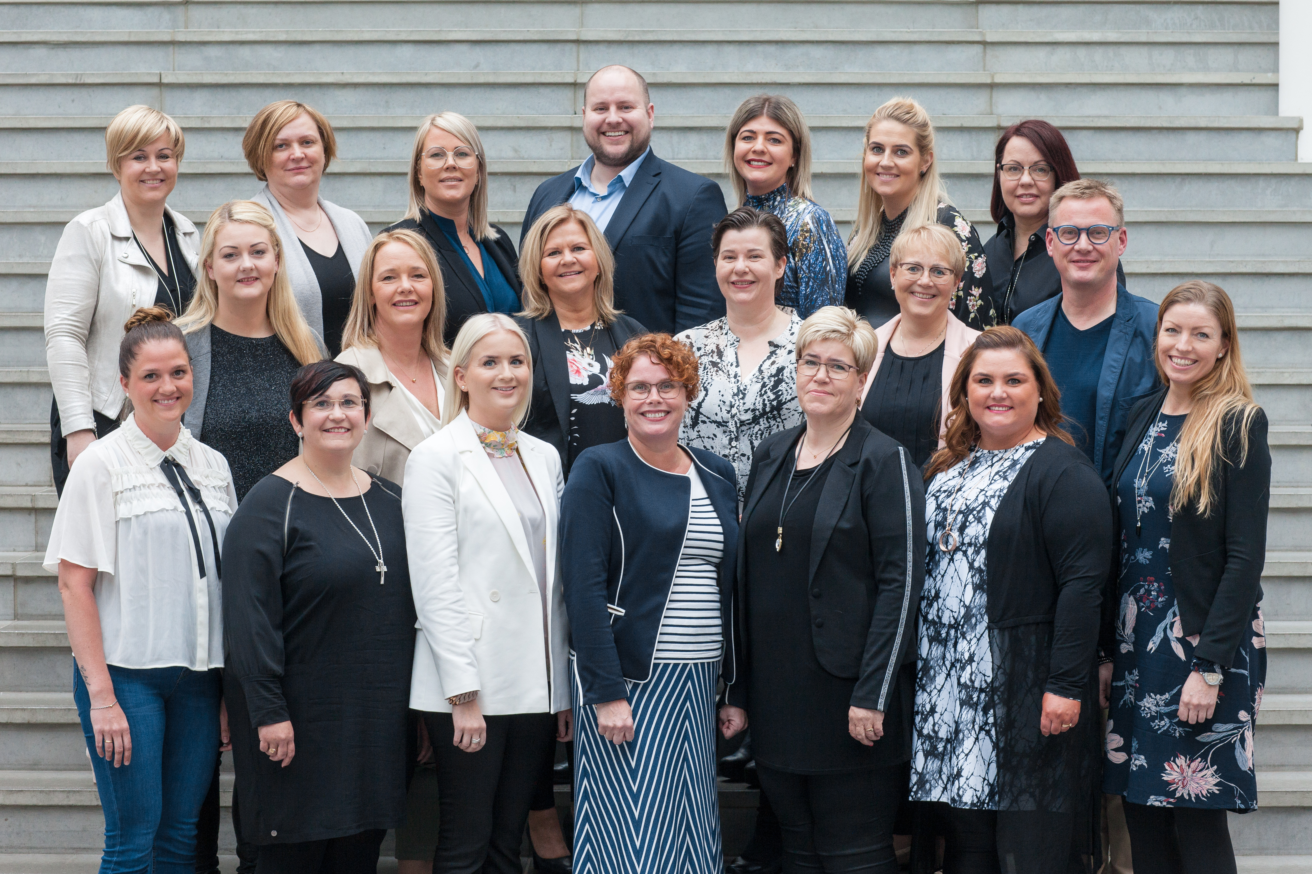 Útskriftarhópurinn. Neðsta röð: Tara Elíasdóttir, Helga Jónína Guðmundsdóttir, Þóra Björk Gísladóttir, Særún Guðjónsdóttir, Arnrún Sigurmundsdóttir, María Jóna Jónsdóttir og Berglind Bergsdóttir. Miðröð: Hrund Pálsdóttir, Jórunn Ólafsdóttir, Sigríður Bjarnadóttir, Erla Stefánsdóttir, Svanhildur Halldórsdóttir og Marteinn Ó. Tryggvason Tausen. Efsta röð: Guðrún Sigurðardóttir, Steinunn Sturludóttir, Fjóla Kristinsdóttir, Hjörtur Torfi Halldórsson, Elín Björg Arinbjarnardóttir, Bjarney Sigurðardóttir og Unnur Linda Guðmunsdóttir. Á myndina vantar Brynjar Árnason og Gísla Gunnar Geirsson.[/caption]
